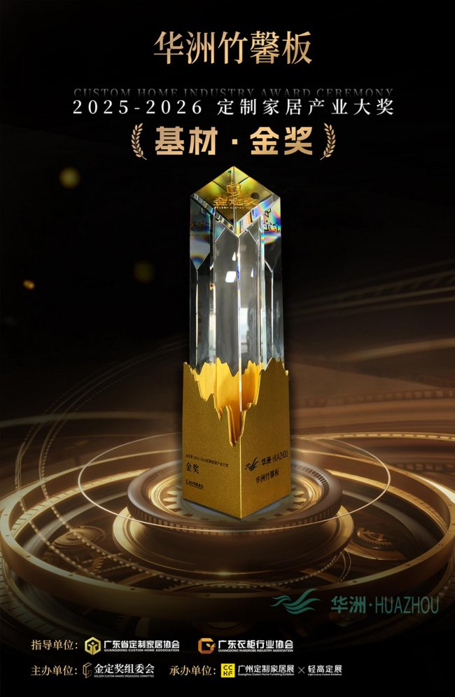 3月30 日,2025-2026 金定奖・定制家居产业大奖在广州圆满落幕。这场汇聚950余家企业、历经数月严苛评审的行业盛事,最终诞生了本届最耀眼的赢家 ——华洲木业。凭借旗下竹馨板斩获基材类金奖,叠加此前金品澳桉板已获金定奖板材金奖,华洲成为实现双金加冕的板材品牌,以绝对实力领跑高端环保基材赛道。